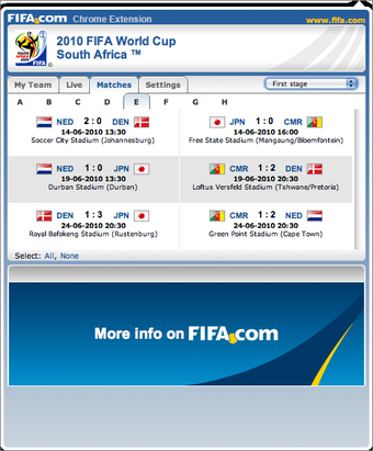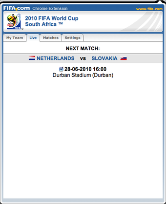 De gratis FIFA.com Chrome Extension informeert je vanuit de browser over het WK 2010 in Zuid-Afrika. Zo weet je als geen ander over het wie, waar, wanneer en hoe van 's werelds grootste voetbalevenement.